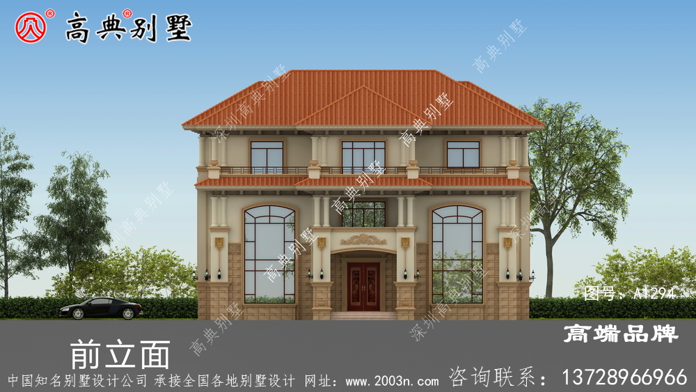 A1294号别墅外墙主要材料:砂岩石板材、真石漆、外墙欧式水泥构件线条及装饰柱、屋面310X310S瓦